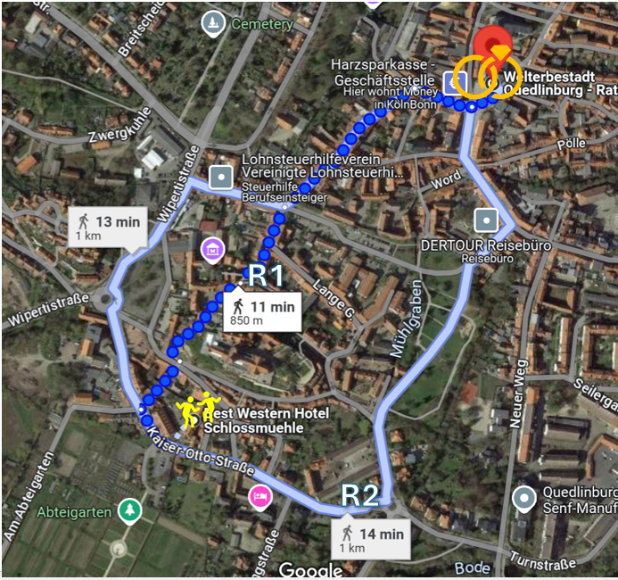 Viele Wege führen zum Standesamt. Die Variante R1 führt über den sehenswerten Quedlinburger Schlossberg. Hier ist ein kleiner Anstieg sowie vorwiegend Kopfsteinpflaster zu bewältigen. Die Variante R2 ist die etwas längere, aber dafür fuß- und absatzfreundlichere Variante durch den Wordgarten.